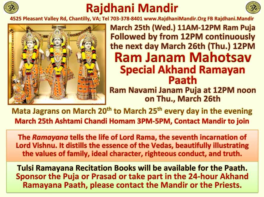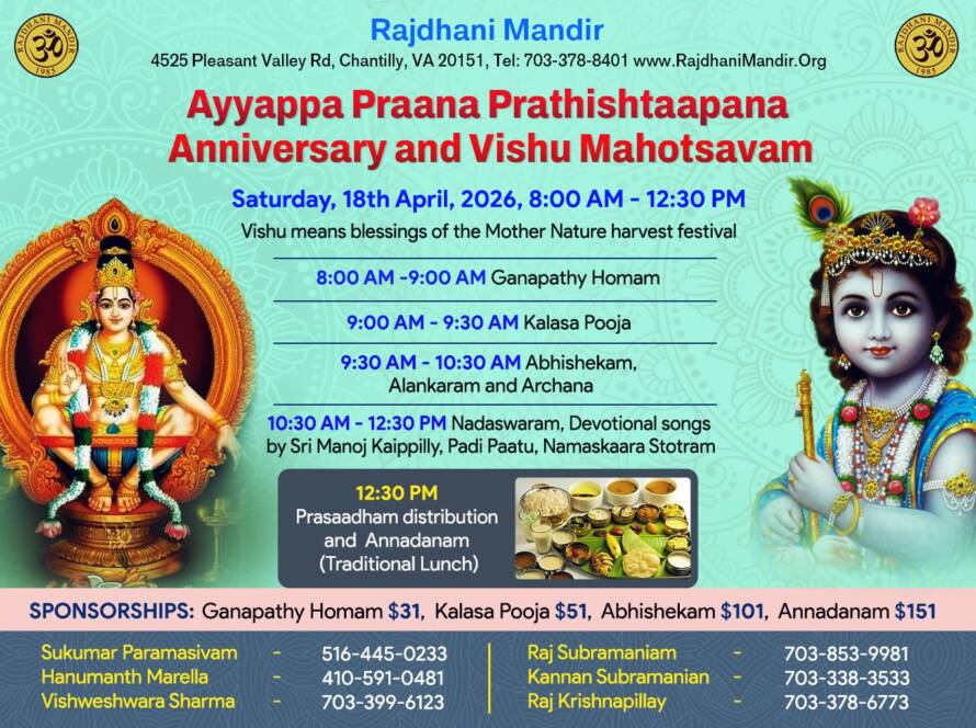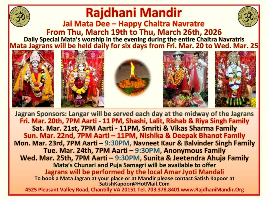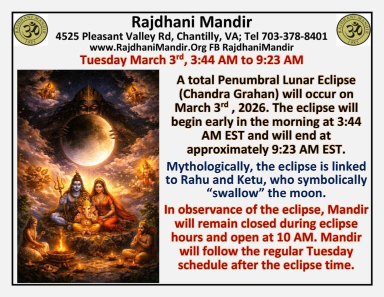 The Rajdhani Mandir, located in Chantilly, Virginia, was inaugurated in March 2000 on an eight-acre wooded site. Representing Hindu, Jain, and Buddhist faiths, it serves as an oasis for the DC Hindu community. The Mandir provides a serene environment for people to connect with God and offers a well-lit prayer hall. It caters to religious needs through scheduled pujas and abhishekams, while also hosting cultural programs and Sunday religion classes for children to preserve our heritage.