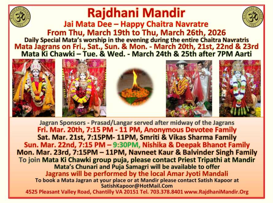 The Rajdhani Mandir, located in Chantilly, Virginia, was inaugurated in March 2000 on an eight-acre wooded site. Representing Hindu, Jain, and Buddhist faiths, it serves as an oasis for the DC Hindu community. The Mandir provides a serene environment for people to connect with God and offers a well-lit prayer hall. It caters to religious needs through scheduled pujas and abhishekams, while also hosting cultural programs and Sunday religion classes for children to preserve our heritage.